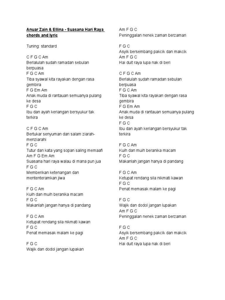 Download 1 file. Lagu suasana hari raya nyanyian anuar zain dan elina ini sentiasa menjadi pilihan peminat tatkala raya menjelma. Ellina feat Anuar Zain - Suasana Hari Raya Chord.